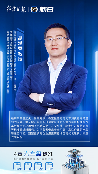 新日汽車級鋰電池的硬核實力,不僅經過了實驗室的嚴苛檢驗,也獲得了清華大學電機系電力系統研究所教授、博士生導師胡澤春教授的證言,他認為具備“4重汽車級標準”的汽車級鋰電池應用到電動車上,在安全性、穩定性、續航能力等方面均超過新國標。