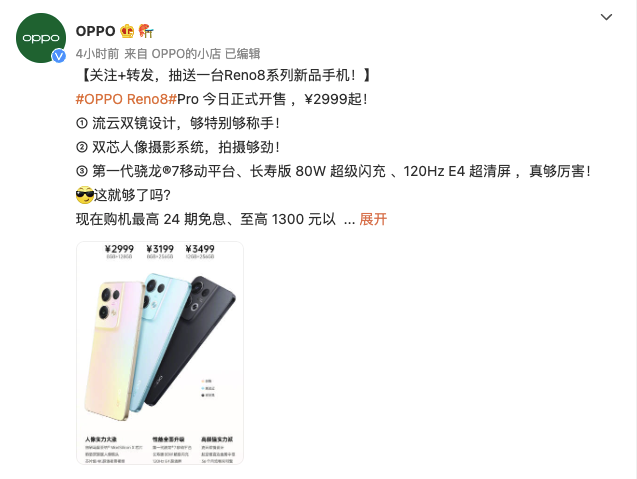 目前,OPPO Reno8 Pro已經正式開售,8+128GB版2999元、8+256GB版3199元、12+256GB版3499元,OPPO商城、天貓、京東等線上和OPPO線下門店均有現貨銷售,感興趣的可以了解一下。