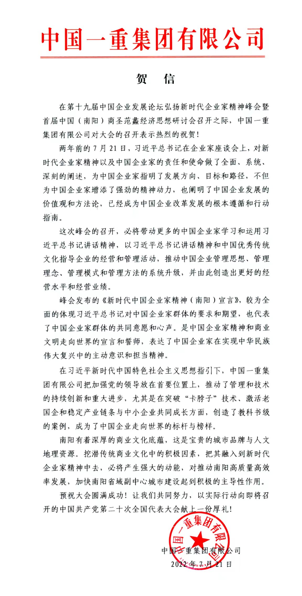 7月21日—7月22日,以“傳承中華優(yōu)秀文化,弘揚新時代企業(yè)家精神”為主題的第十九屆中國企業(yè)發(fā)展論壇弘揚新時代企業(yè)家精神峰會暨首屆中國(南陽)商圣范蠡經(jīng)濟文化研討會在河南省南陽市舉辦。本次研討會由中國企業(yè)聯(lián)合會、中國企業(yè)家協(xié)會、中國企業(yè)文化促進(jìn)會指導(dǎo),南陽市人民政府、《中國企業(yè)報》集團(tuán)主辦,中共南陽市委宣傳部、南陽市工業(yè)和信息化局、南陽市招商投資促進(jìn)局、南陽理工學(xué)院、南陽市宛城區(qū)人民政府協(xié)辦。《中國企業(yè)報》集團(tuán)副社長、副總裁張博宣讀中國一重集團(tuán)有限公司發(fā)來的賀信。