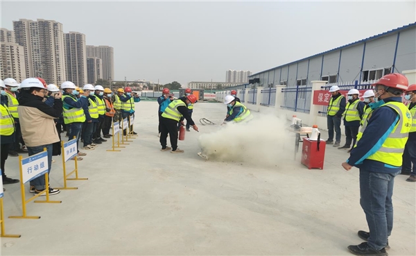 最后,在現場開展模擬火災救援演練,項目管理人員與施工作業人員進行現場滅火實操演練。