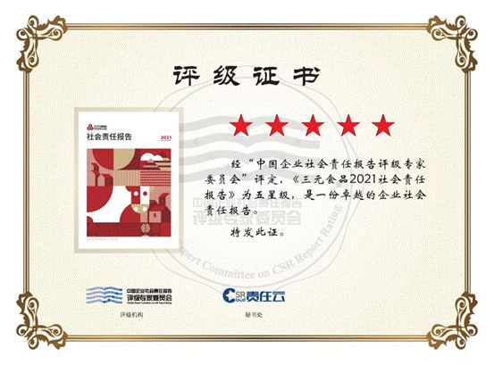 近年來(lái),三元食品始終保持與利益相關(guān)方充分交流與溝通。2022年,三元食品發(fā)布的第8份年度社會(huì)責(zé)任報(bào)告,并連續(xù)四年獲評(píng)中國(guó)企業(yè)社會(huì)責(zé)任報(bào)告評(píng)級(jí)專家委員會(huì)"五星級(jí)"評(píng)價(jià)。評(píng)級(jí)專家委員會(huì)評(píng)價(jià),《北京三元食品股份有限公司2021社會(huì)責(zé)任報(bào)告》是一份卓越的企業(yè)社會(huì)責(zé)任報(bào)告。