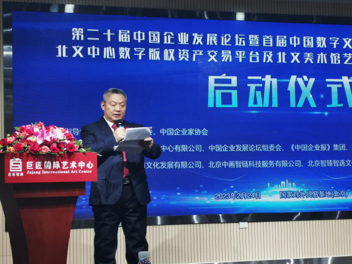 2023年2月24日,第二十屆中國企業發展論壇暨首屆中國數字文化產業投資高峰論壇啟動儀式在國家對外文化貿易基地(北京)舉行。與此同時,北文美術館藝術品交易服務平臺、北文中心數字版權資產發行平臺啟動儀式也如期舉辦。