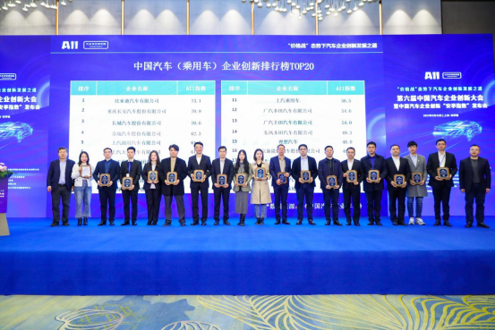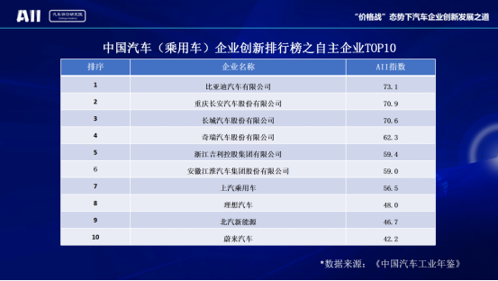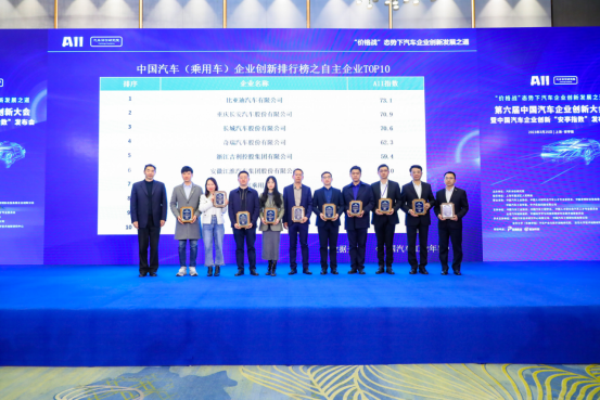 中國汽車(乘用車)企業創新排行榜之自主企業TOP10