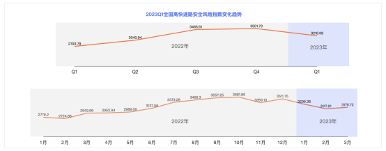 數據顯示,全國高快速路的安全險指數環比2022第四季度下降8.16%,全國高快速路的危險駕駛行為(即三急一超:急加速、急減速、急轉彎和超速)與2022第一季度比較,超速、急轉彎的變化趨勢一致,急加速、急減速則在2023年3月呈現下降向好趨勢。