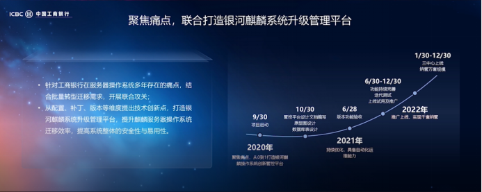 大會還邀請了來自通信、金融等重點關基行業的企業代表,分享銀河麒麟操作系統系列產品在各行業落地應用的成功案例。中國移動信息技術中心PaaS架構師魏寶輝帶來題為《中國移動磐基容器云操作系統升級實踐》的主題分享,介紹了中國移動與麒麟軟件攜手打造云原生操作系統,探索數字化云原生轉型的創新實踐。中國銀行股份有限公司信息科技部技術經理張馳則以《中國銀行信創操作系統實踐》為題,介紹了銀河麒麟操作系統部署情況及多場景應用適配工作成果,并表示將與麒麟軟件攜手共同建設符合金融業務領域的多樣化信創終端業務場景。