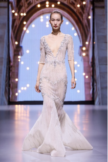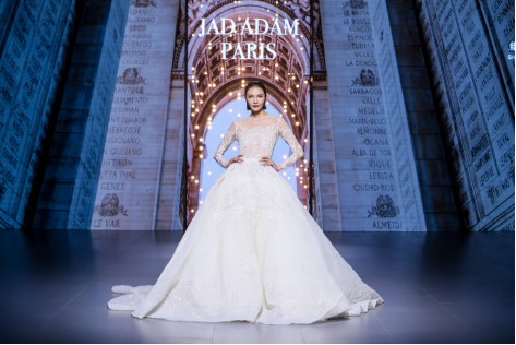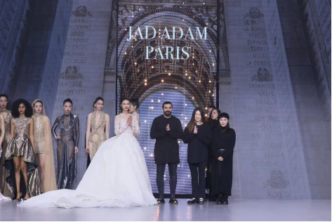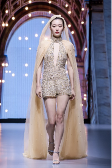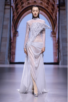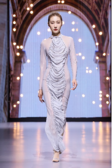 在充滿(mǎn)異域風(fēng)情的“巴爾米拉女王”主題發(fā)布中,法國(guó)高定女裝設(shè)計(jì)師JadAdam攜手紹興永耀紡織品有限公司、紹興晶遠(yuǎn)創(chuàng)意設(shè)計(jì)有限公司展現(xiàn)了尋找內(nèi)心平靜的啟蒙之旅的獨(dú)特過(guò)程。設(shè)計(jì)師從柯橋優(yōu)秀的面料中獲得啟發(fā),在華麗的禮服裙中采用了大量的刺繡及繡片繡珠工藝。兩家企業(yè)提供的閃光高密度歐根紗、銀色金屬絲、清透網(wǎng)眼等面料,花型立體簡(jiǎn)潔、色彩透亮多變,為設(shè)計(jì)師帶來(lái)了豐富的靈感。從晚禮服、婚紗到高級(jí)時(shí)裝,JadAdam通過(guò)特有的藝術(shù)表現(xiàn)手法詮釋了本次禮服設(shè)計(jì)。