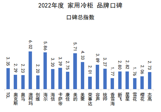 口碑總指數方面,與上期相比,新入榜品牌有TCL、創維;落榜品牌有惠康、晶弘。澳柯瑪、海爾、美的在口碑總指數中位居前三。澳柯瑪、海爾、美的、美菱、容聲、卡薩帝、統帥、海信、星星在近兩期中表現穩定,口碑總指數位居前十。TCL在本期口碑總指數中有強勁表現,晉升至前十,新飛則在本期口碑總指數中掉出前十。