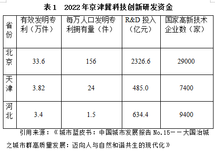 與北京相比,天津和河北在創新能力方面仍存在較大差距,近年來差距進一步擴大,制約了京津冀三地的創新合作空間。從創新投入來看,《2023京津冀將如何推進?》表明,2022年北京研發投入強度達到6.44%,天津和河北研發投入強度分別為3.44%和1.75%,遠低于北京的投入水平,河北低于全國平均水平0.65個百分點。自2014年以來,天津和河北與北京之間的差距一直很大。從研發資金的絕對數量來看,2022年差距很大(見表1)。近年來,京津冀三地的金融支持能力進一步擴大,縮小差距變得更加困難。《城市藍皮書:中國城市發展報告No.15——大國治城之城市群高質量發展:邁向人與自然和諧共生的現代化》中指出,從創新產出來看,2022年,北京專利授予量為16.3萬件,分別是河北和天津的1.8倍和2.2倍;有效發明專利33.6萬件,分別是河北和天津的9.9倍和8.8倍。以人均人數而言,差距更為明顯,北京每萬人的發明專利數量大約是河北的10倍。