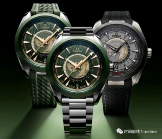這款世界時的細節在于,內表盤的海洋顏色與手表配色一致,鈦殼是灰色、鋼殼是綠色;陸地則采用激光技術進行著色,金色是高海拔地區。其中鈦金屬表盤的黑灰色都是由激光歐米茄的地圖是以北極為中心的北半球,我們可以注意到,地圖帶有微微的弧形效果,模仿了真實的地球曲率。盤面上帶地圖的表不少,但像歐米茄做的這么細致真實的,極少。