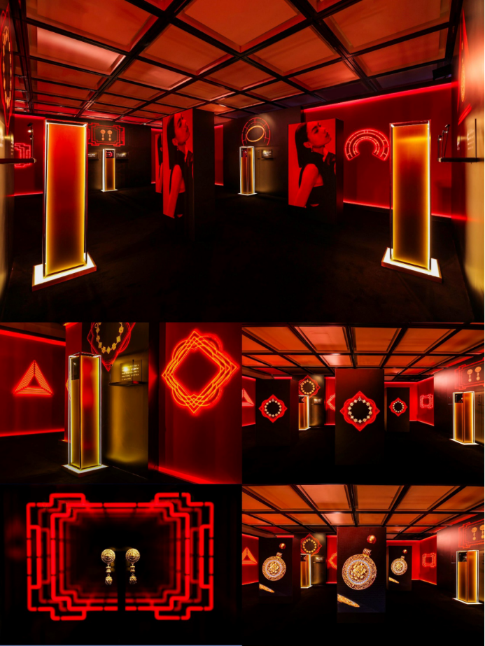 博大精深的中國傳統文化孕育出無限創造力和想象力,因此周大福珠寶集團在探索珠寶美學與中國傳統文化相結合的過程中不斷推陳出新,呈獻許多匠心獨運的藝術臻品——標志性的周大福傳承系列作品。此次GOLD IS CHIC鎏光時代·周大福傳承系列黃金美學藝術展跨越時空界限,將蘊含歷史、文化的黃金美學呈現到大眾視野中,全方面展現黃金珠寶設計背后的時尚創意靈感、精益求精的工藝和具有東方韻味的藝術美學理念。此次展覽的空間設計從周大福傳承系列視覺大片中汲取靈感,衍生出紅黑金三色、光影不斷變換、又極富想象力的三個空間,以創新的藝術視角展現品牌具有中國傳統文化內涵的時尚潮流形象。置身于展覽空間,映入眼簾的是霓虹線條與迷離燈光相互交織而成的“時光隧道”,使人仿佛置身于過去與未來的交界地。光影流動的變幻間,映照出品牌歷經歲月沉淀后的璀璨輝煌,這意味著品牌正開啟黃金世代的嶄新篇章。