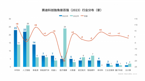 賽迪科創獨角獸百強(2023)在新材料行業實現新突破,受益于我國新能源汽車市場爆發,帶動上游鋰電池正極材料、電解液、隔膜等需求加速釋放,有3家新材料行業企業首次入圍獨角獸百強,分別是融通高科、福建德爾、先導薄膜;同時,獨角獸百強前10名中新能源及新能源汽車行業獨占5席,排名均在前六名。從數量分布看,半導體、人工智能、新能源行業分布數量位列前三,上榜企業數量分別達到23家、22家、14家,其中,半導體與新能源行業上榜企業數量增長最多,分別增加9家和8家,成為最熱門賽道。